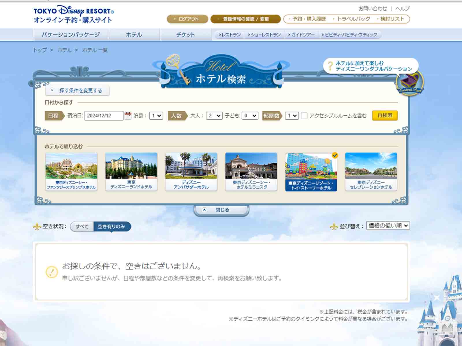 お探しの条件で空きはありませんと出て