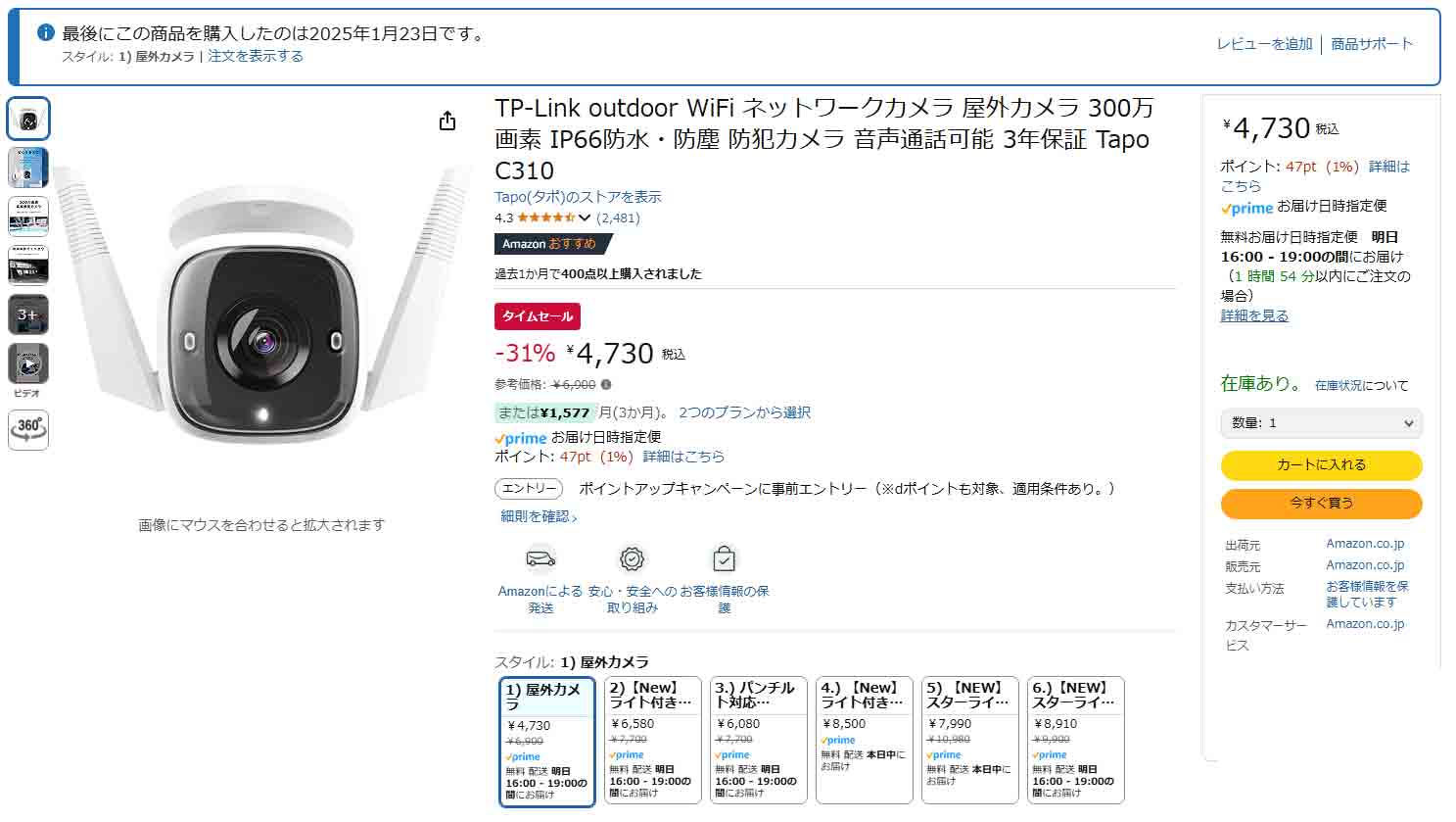 昨日見るとタイムセールで4730円で販売されており、少しがっかりしました。