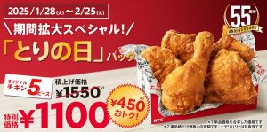 28日はKFC「とりの日パック」 日記・コラム・つぶやき 2025/01/28 7:46 今日は28日、【とりの日パック】が特別価格で提供される日ですね!✨ 【新!とりの日パック】は、通常価格より450円もお得な1100円で提供されます。 これで約1か月近くも楽しめるということなので、 このチャンスは見逃せません🐔。 毎月28日にこんなお得なパックが販売されるなんて、嬉しいですね。 週末買ってこようかな