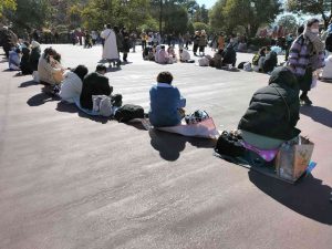 今日はすごく天気は良く 真っ青な空だけどかなりの 強風なので パレードのハーモニーインカラー中止です イッツ・ア・スウィーツフルタイム!中止じゃないといいけどな 無理っぽいかな 場所取り頑張ってる人いるけどね