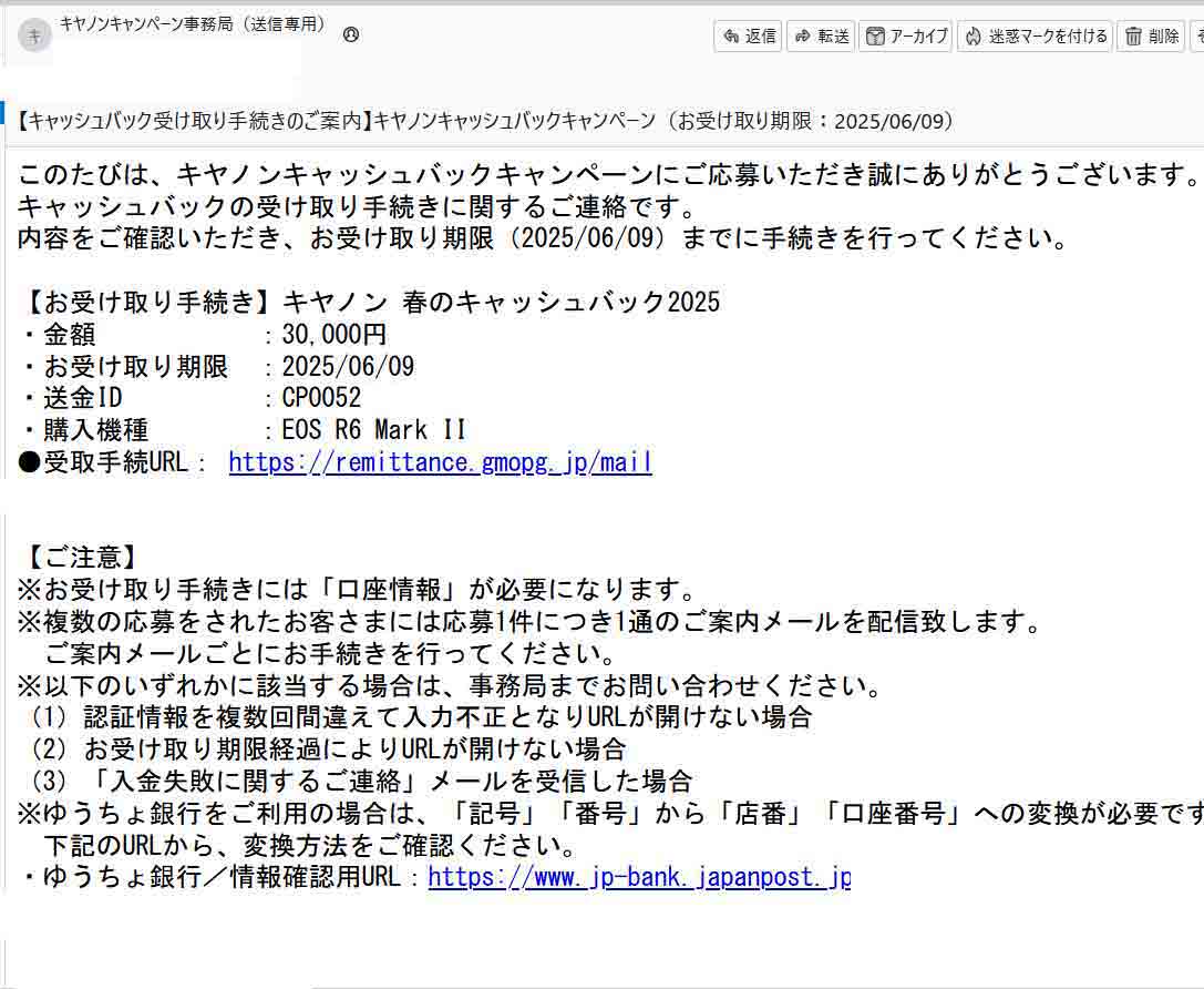 先日、キヤノンのキャッシュバックキャンペーンに申し込んだのですが、振込案内のメールがなかなか届かず、正直少し心配していました。
