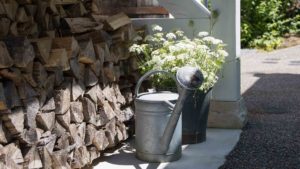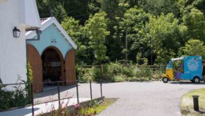 オキノ邸の全景が見える丸い花壇付近には、ホウキとデッキブラシが置いてあり、誰もがジャンプ!飛んだ瞬間を写真に収めて、ちょっとした“魔女気分”を楽しめる。