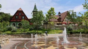 グーチョキパン屋とハッター帽子店を噴水越しに撮影