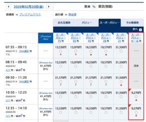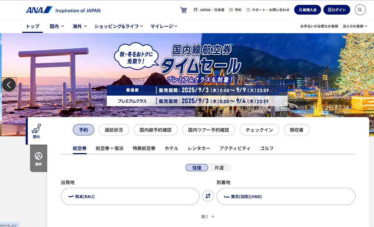 ANAのタイムセールページで検索開始!