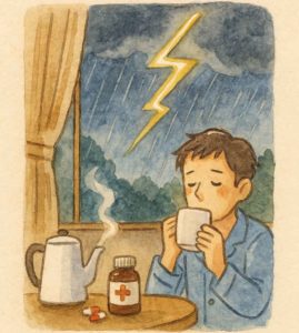 風邪はまだ治らず、喉の奥に残る違和感と頭の重さ。 朝起きてコーヒーをいれるためゆっくりと湯を沸かす。 湯気が立ちのぼるキッチンで、今日一日の始まりを静かに受け入れる。 朝食後に風邪薬と頭痛薬を服用。 薬の効き目に期待しつつ、今日からまた仕事が始まる。 体調は万全じゃないけれど、少しずつ、少しずつ。 雷雨の余韻を背負いながら、今週も歩き出す。