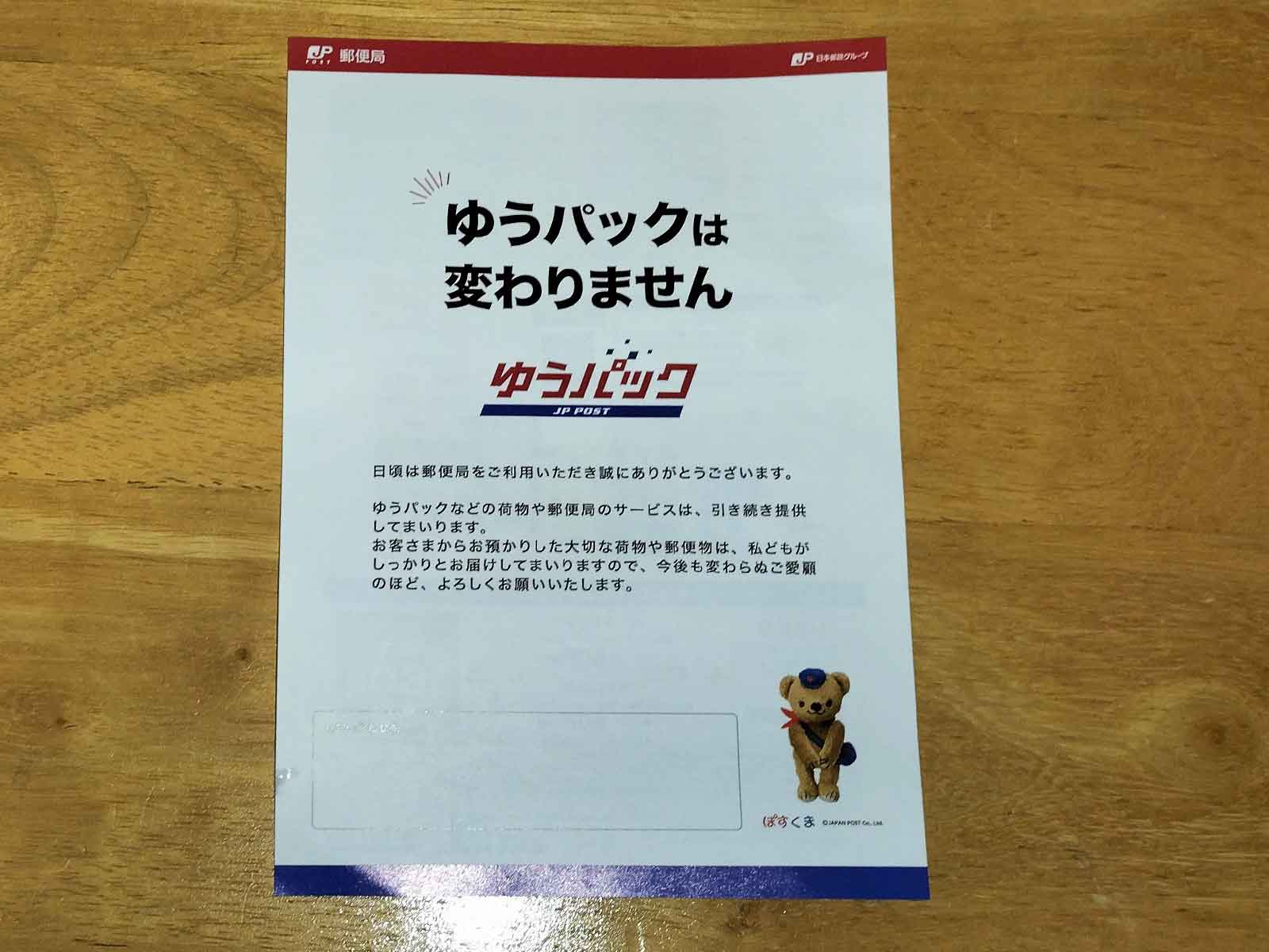 昨日、郵便受けに郵便物と一緒に一枚の紙が入っていました。 JP POSTの「ゆうパックは変わりません」という案内。 最近の一連の不祥事の影響でしょうか、利用者の不安に対して「変わらずサービスを提供します」と伝える内容でした。