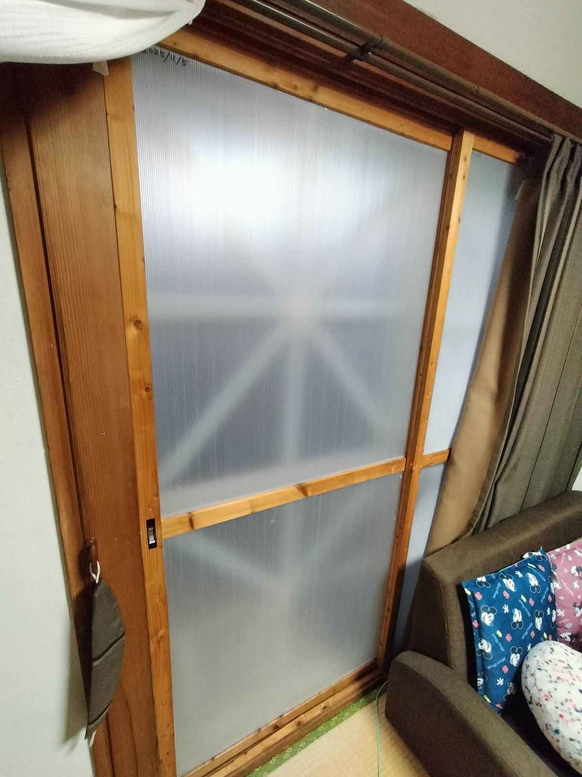 障子のスペースに養生用プラダンを取り付けた建具を取り付ける