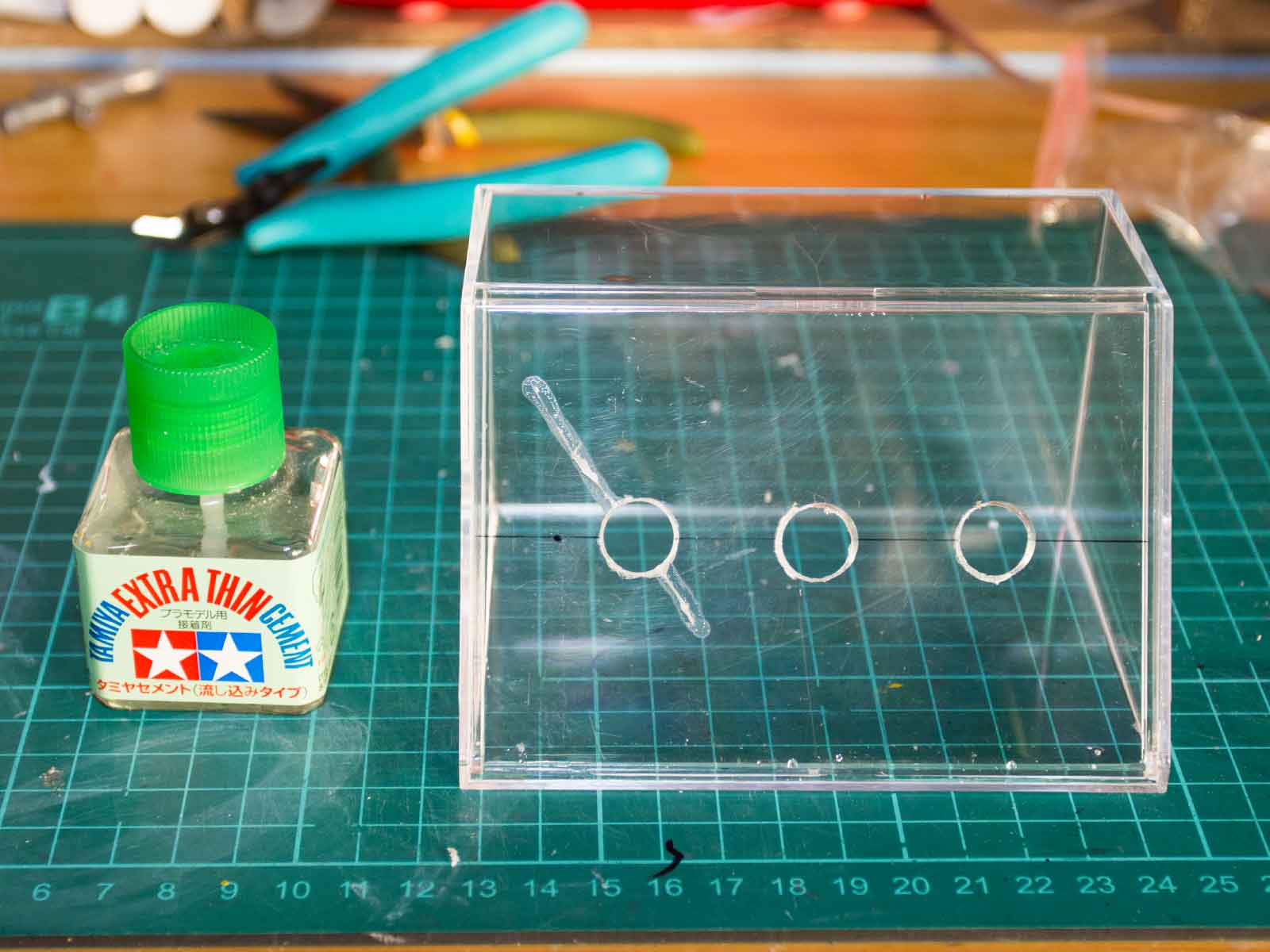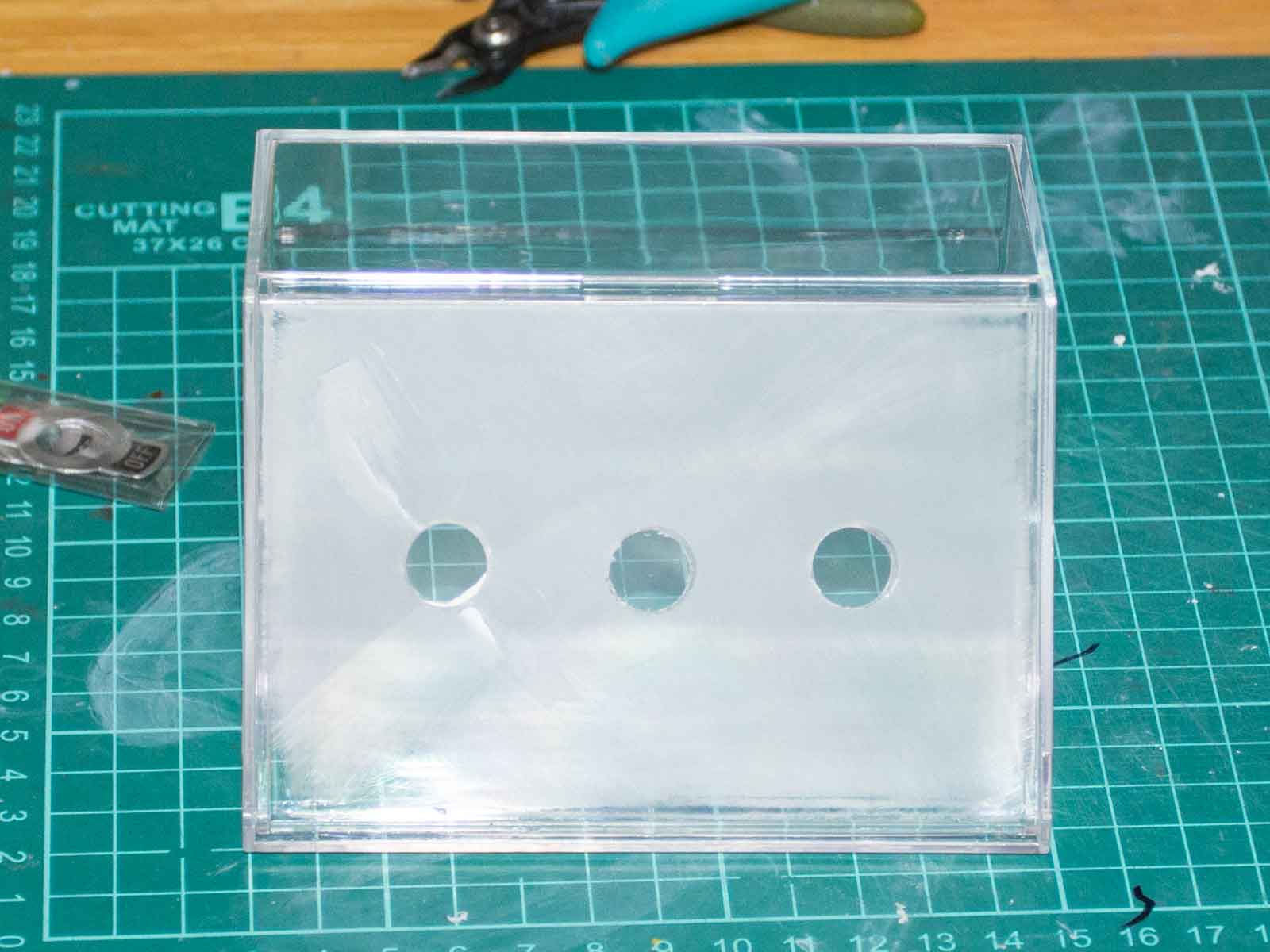 1. アクリルケースに穴をケガいてドリルで加工