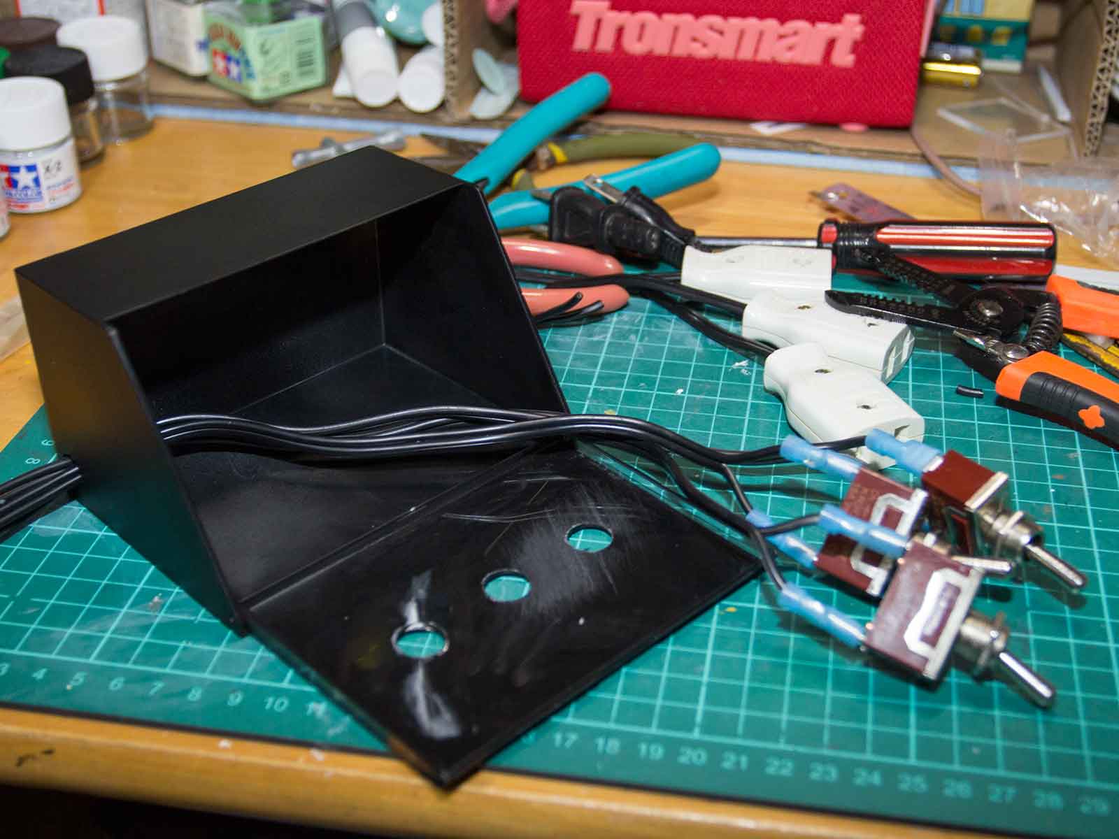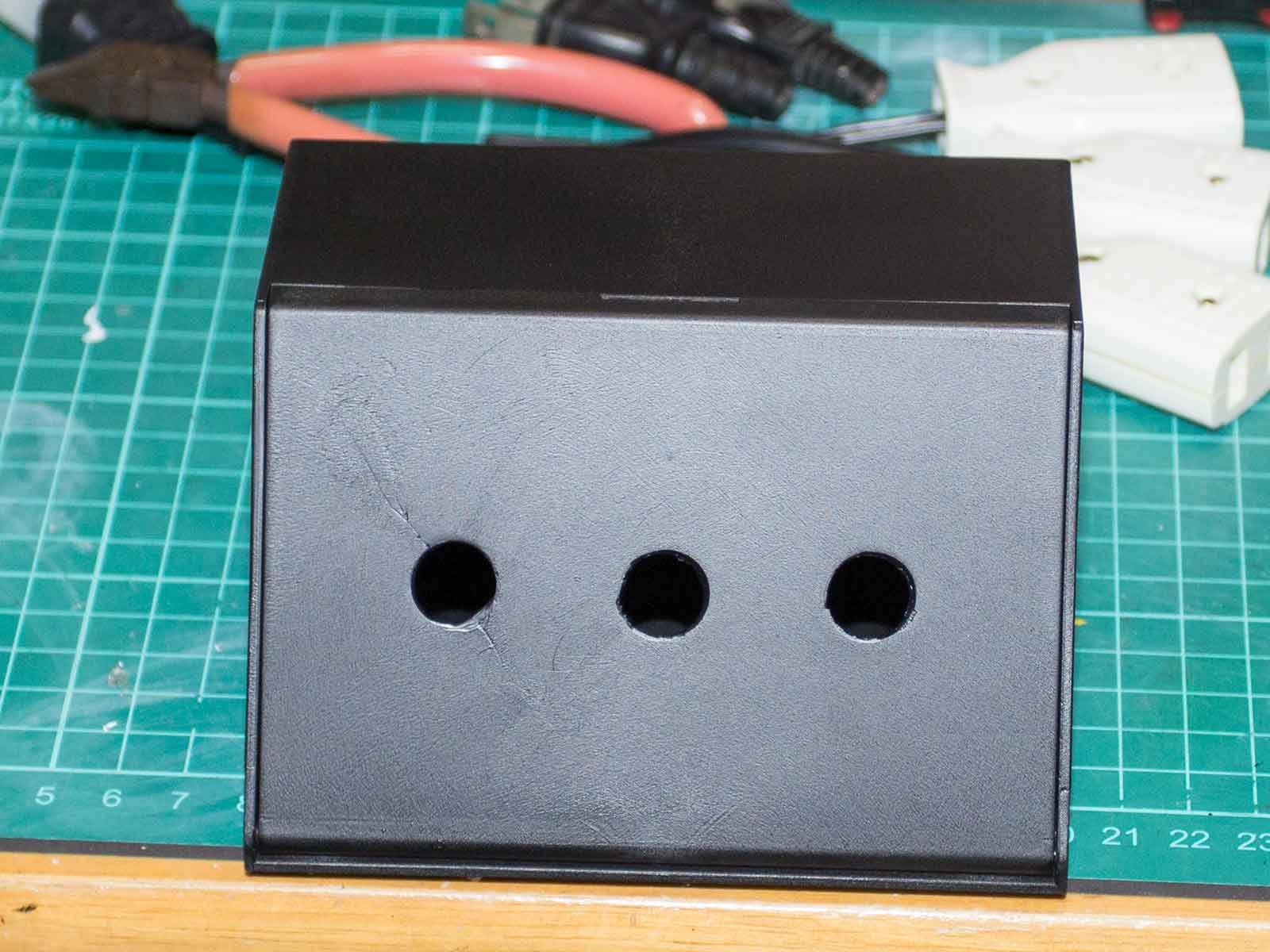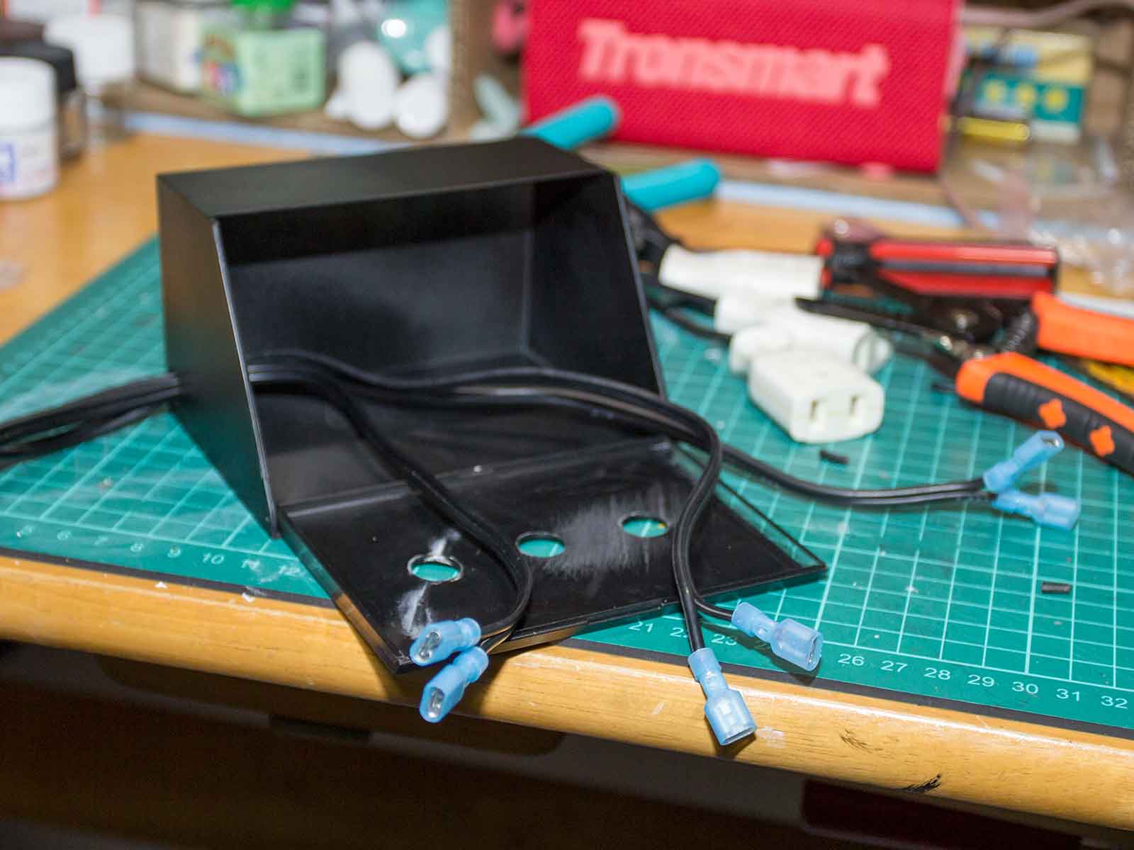 → ケースにスイッチとカバーを取り付け、ACアダプタ用プラグを3つ用意。