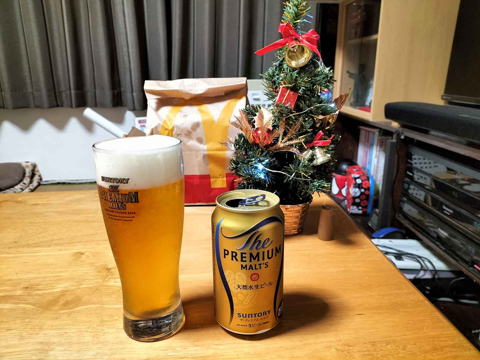 乾杯はもちろん、プレモル。 グラスに注いだ瞬間、泡がふわっと立ち上がって、ちょっとした贅沢気分。 ツリーの横に並べると、なんだかCMみたいな光景に。