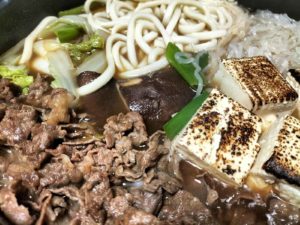 牛肉、白菜、しらたき、椎茸、ネギ、そして自家製焼き豆腐。甘辛い割り下の中で、具材がじゅわっと煮える音が心地よい。