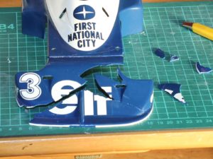 昨日、大破したタイレルP34。 フロントカウルは粉々に砕け、ボディには深い亀裂。 それでも今日は、静かな作業机の上で「再生」というレースが始まりました。 破片を一つひとつ拾い上げ、まるでパズルを解くように接着。 どの角度が正しいのか、どの順番で組むべきか。模型歴が試される瞬間です。 欠損していたパーツには、ガンプラで培った技術でプラバンで形状を再現し、パテで滑らかに整形予定。 レストアはまだ途中ですが、タイレルP34は確かに息を吹き返しつつあります。破損もまた、模型との新しい物語の始まり。完成した暁には、また仲間たちと“走らせる”日が来るでしょう。