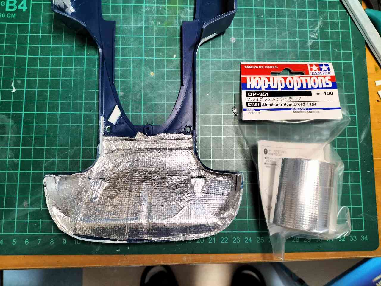 クラッシュ後のボディは、まるでパズルのようにパーツをつなぎ合わせて再構築したが。 見た目は整ってきたものの、強度面に不安が残るため、裏面には**アルミグラスメッシュテープ(TAMIYA OP-351)**を貼って補強しました。これにより、走行時のねじれや振動にも耐えられる構造へと一歩前進。