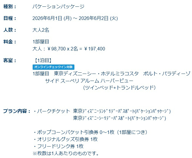 バケーションパッケージなので東京ディズニーランド&シーの1デーパスポートに加え、オリジナルグッズ、フリードリンク券付いて。
