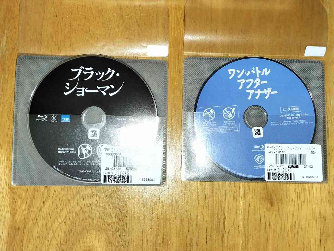 手元に残ったのは、透明スリーブに入った二枚のディスク。 黒いラベルの「ブラック・ショーマン」と、 青いラベルの「ワン・バトル アフター アナザー」。 どちらもレンタル特有のシールが貼られていて、 “今日は映画に浸る日だ”と決めた自分の気持ちがそのまま形になったようだった。
